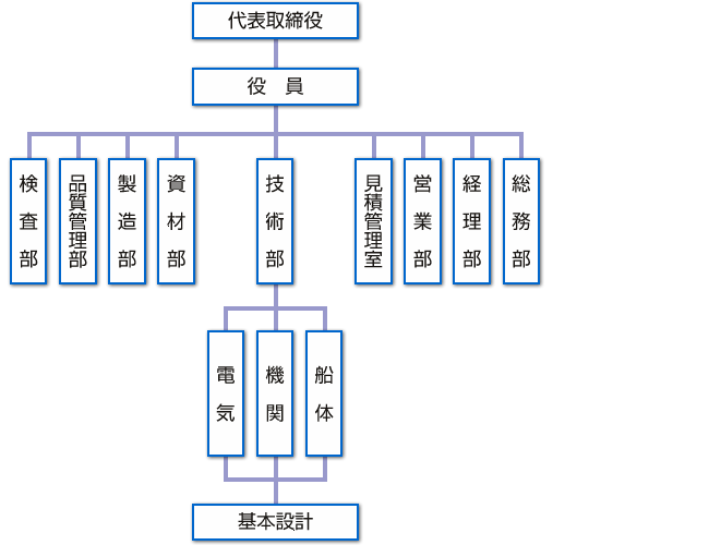 | 営業種目 | 高張力鋼製、アルミニウム合金製、FRP製、木製等各種高速船艇の設計・建造・修理 ①巡視船艇、警備船艇、測量船、消防船艇、油回収船、油処理船 ②漁業取締船、漁業調査船、遊漁船 ③高速観光船、同旅客船、交通船、遊覧船 ④モータークルーザー ⑤曳船、艀等各種港運船 ⑥自社設計による高性能プロペラ(共同開発) |